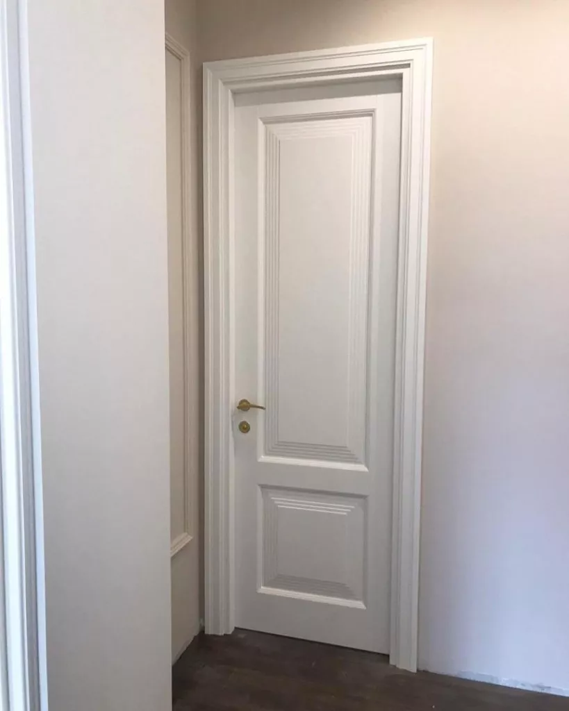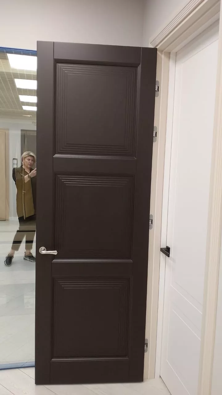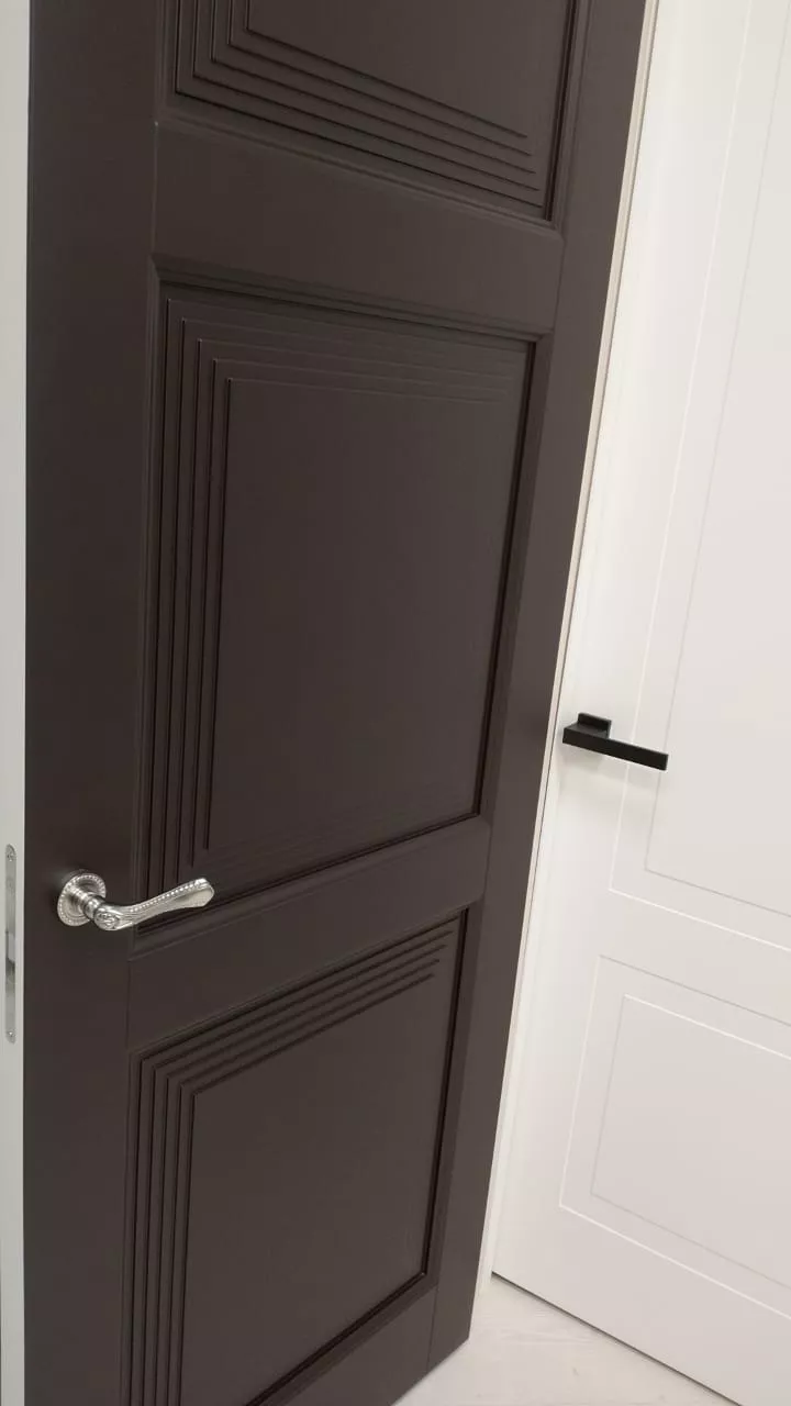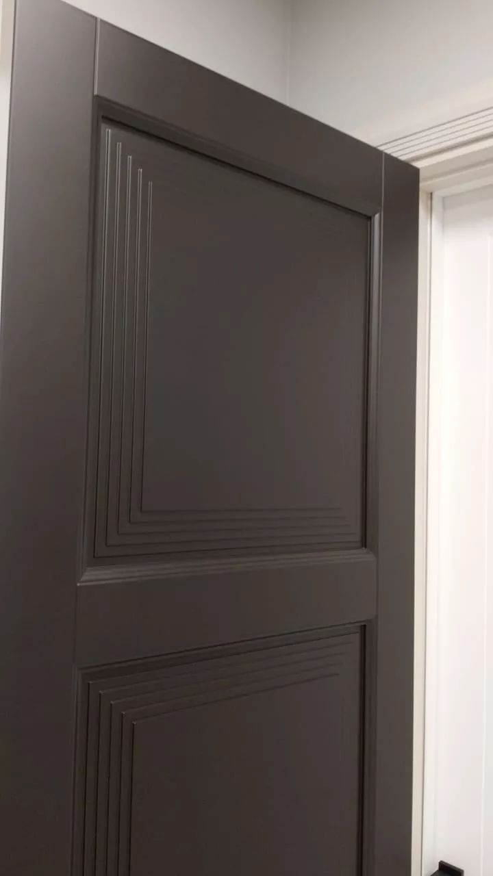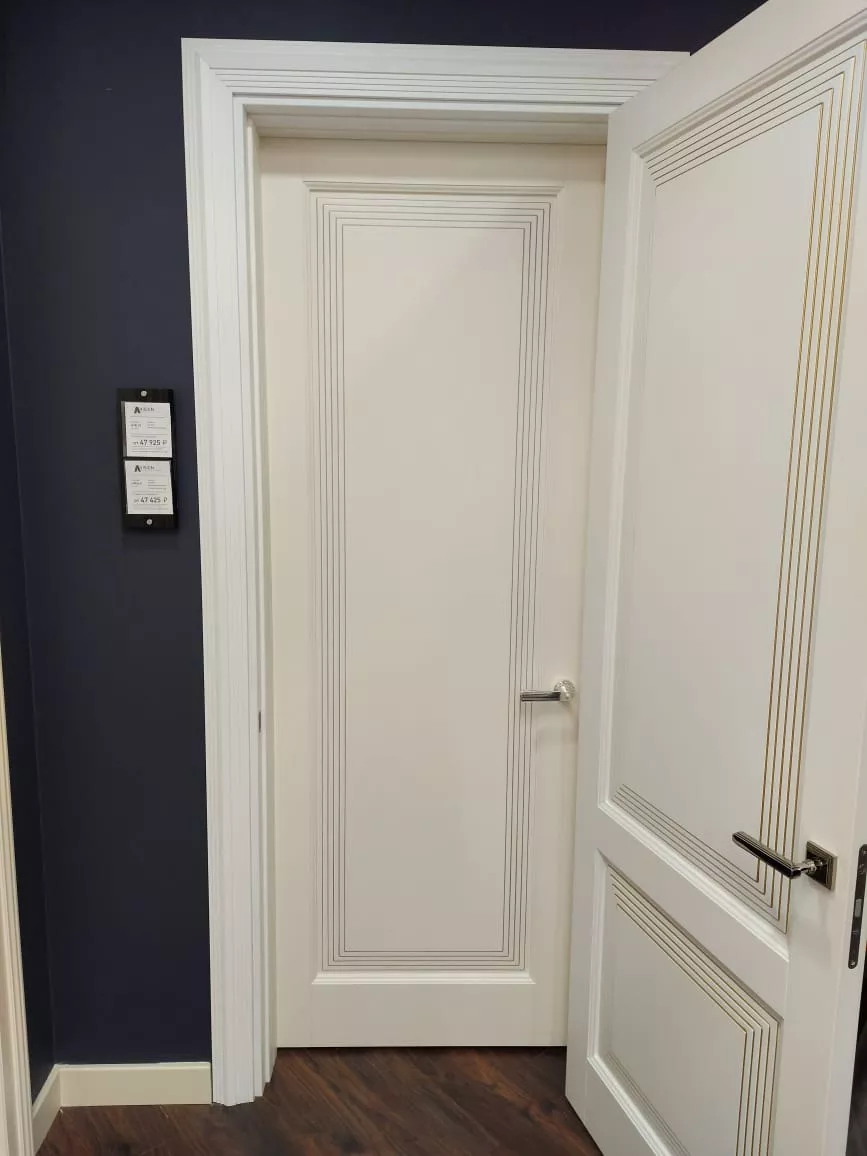 Элегантная дверь с экспрессивными формами. В ее стиле при кажущейся массивности присутствует необычная легкость. Строгие формы фрезерованных дверных панелей удивительным образом сочетаются с широкими наличниками трапециевидной формы, создавая уникальную композицию, которая вызывает подлинное восхищение.