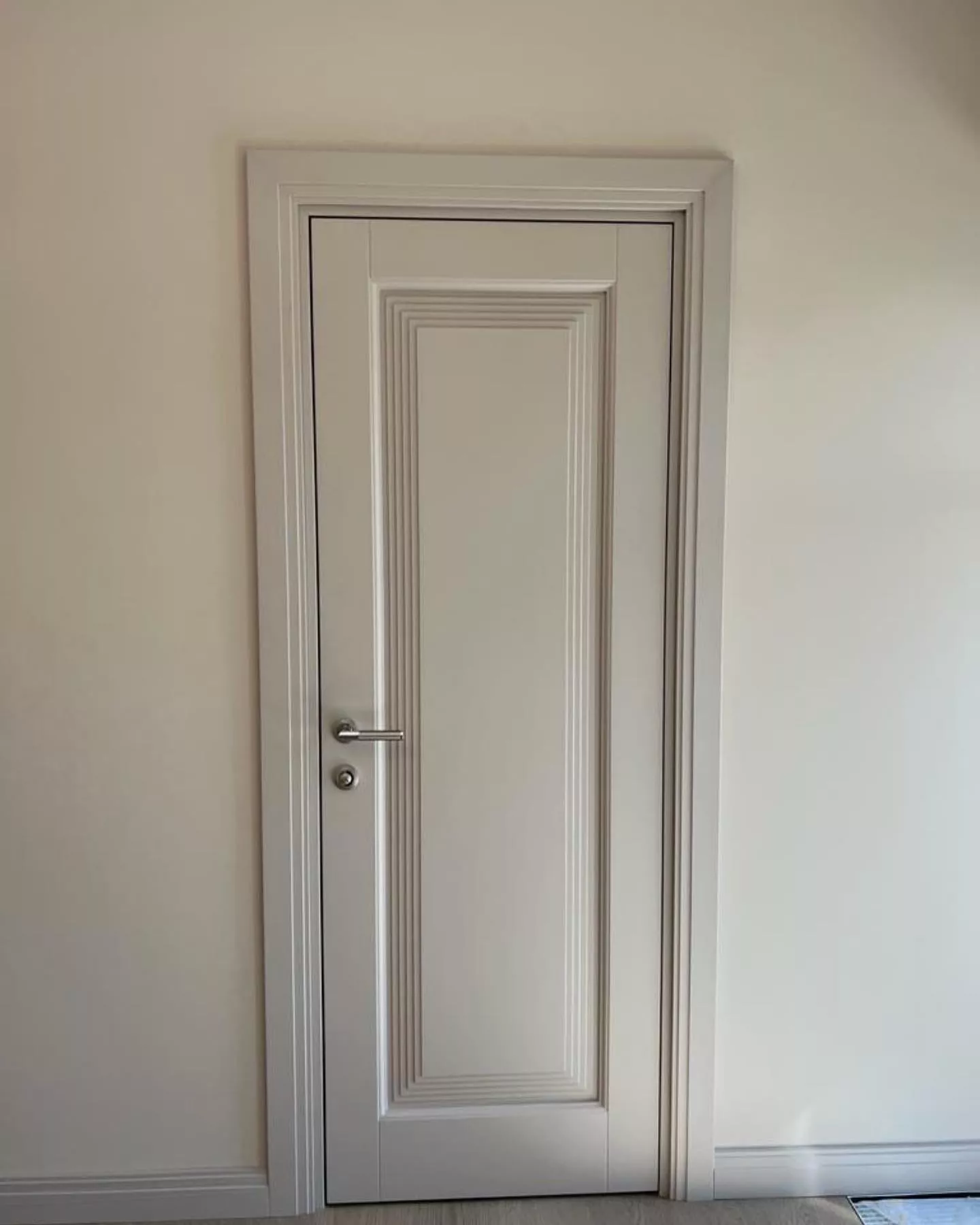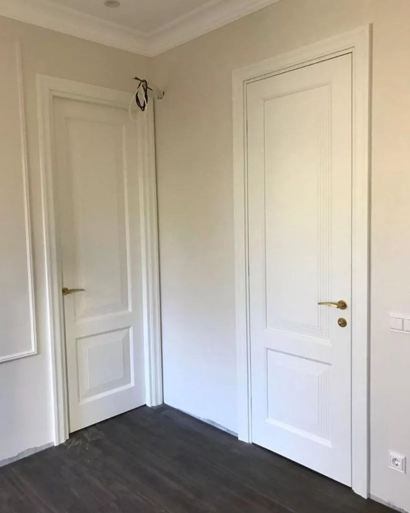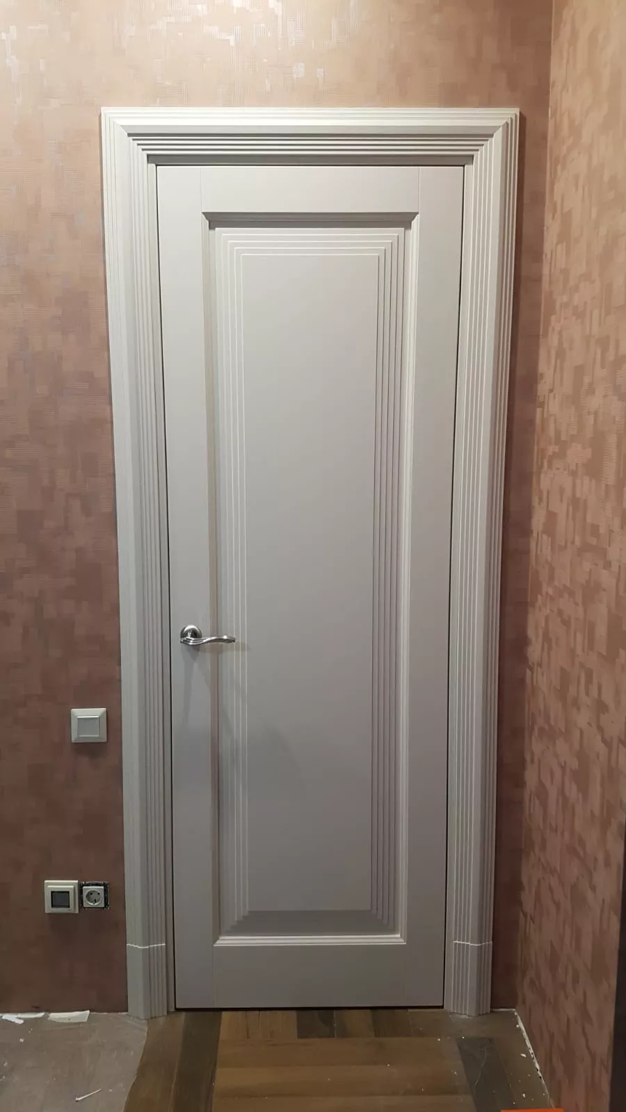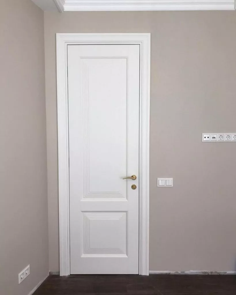 Элегантная дверь с экспрессивными формами. В ее стиле при кажущейся массивности присутствует необычная легкость. Строгие формы фрезерованных дверных панелей удивительным образом сочетаются с широкими наличниками трапециевидной формы, создавая уникальную композицию, которая вызывает подлинное восхищение.