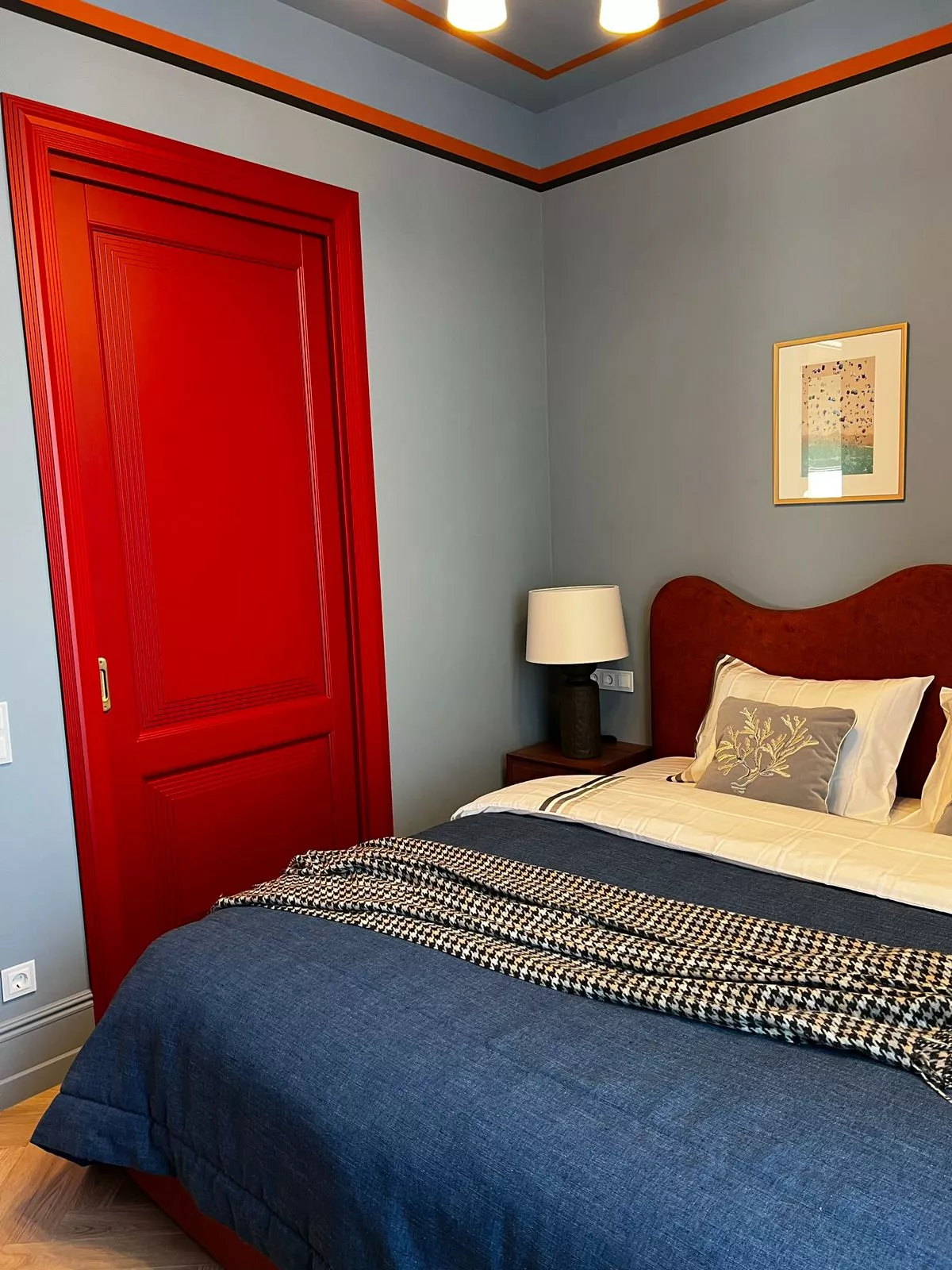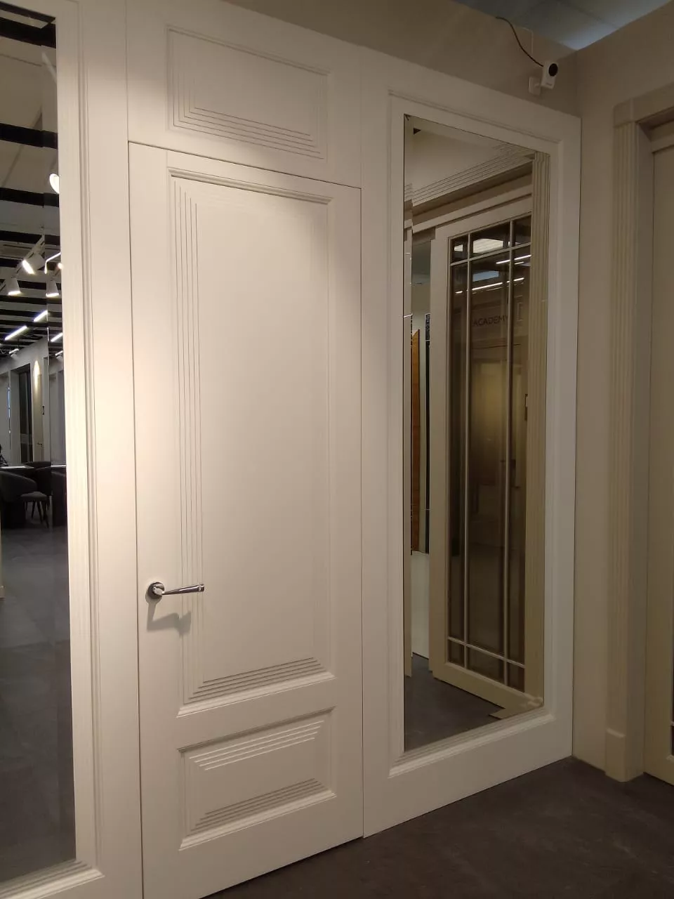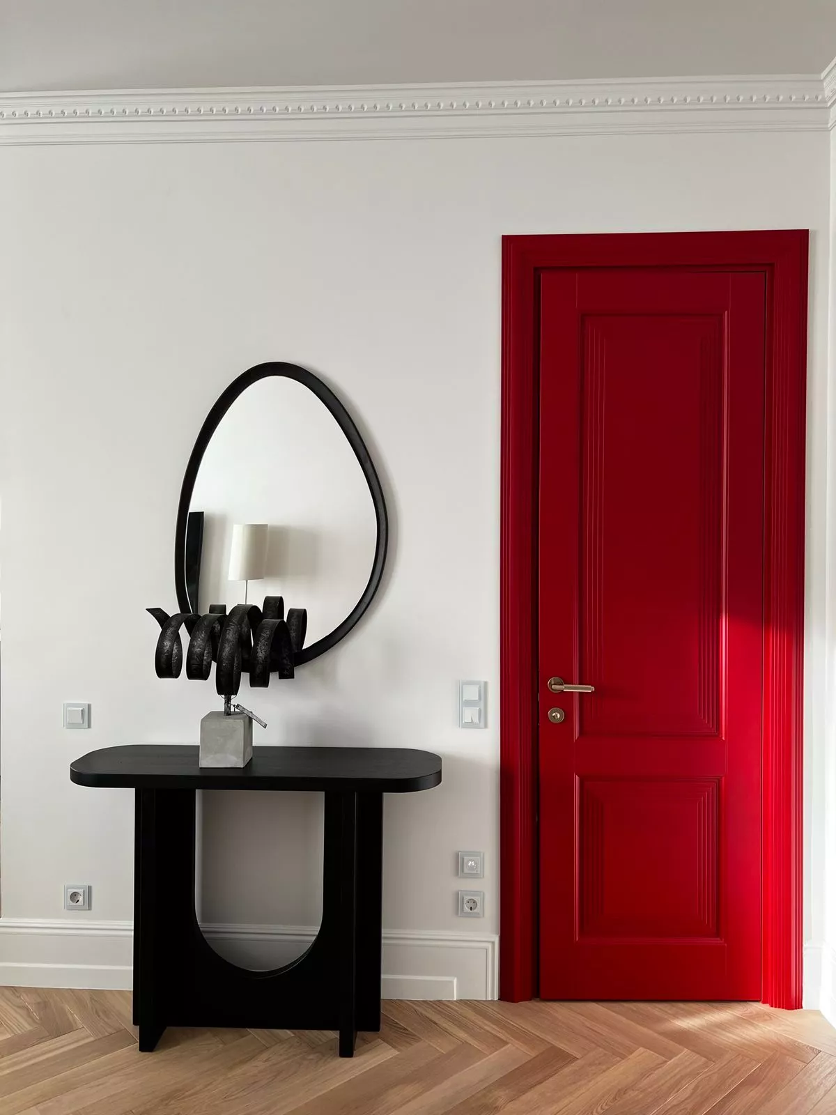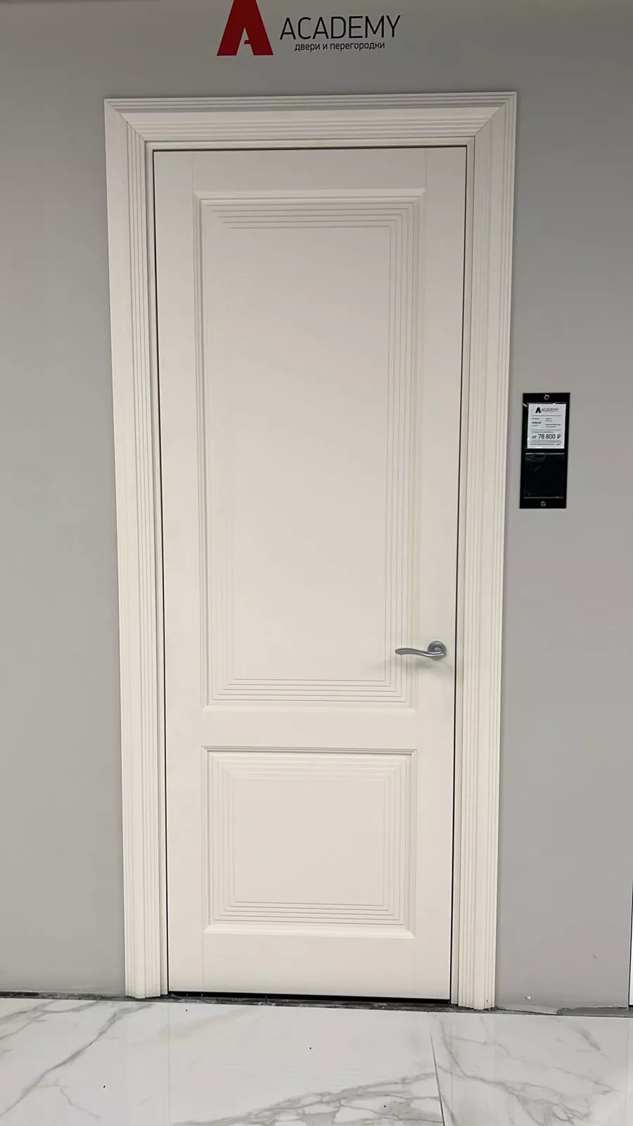Элегантная дверь с экспрессивными формами. В ее стиле при кажущейся массивности присутствует необычная легкость. Строгие формы фрезерованных дверных панелей удивительным образом сочетаются с широкими наличниками трапециевидной формы, создавая уникальную композицию, которая вызывает подлинное восхищение.