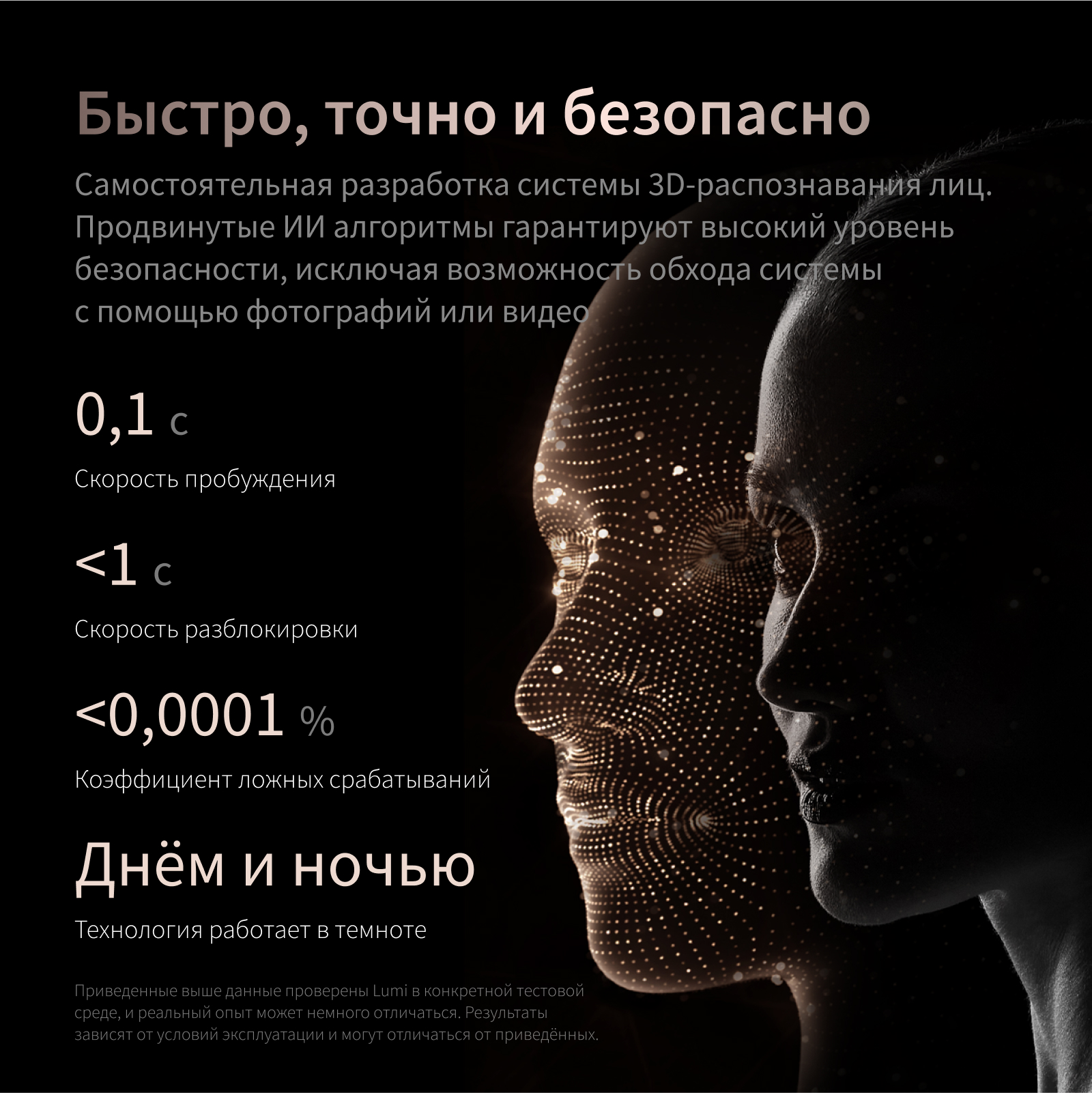 • 3D-распознавание лиц: Быстрое и точное разблокирование дверей благодаря высокоточному моделированию лица и встроенному ИИ-чипу. Продвинутые алгоритмы гарантируют высокий уровень безопасности, исключая возможность обхода системы с помощью фотографий или видео.