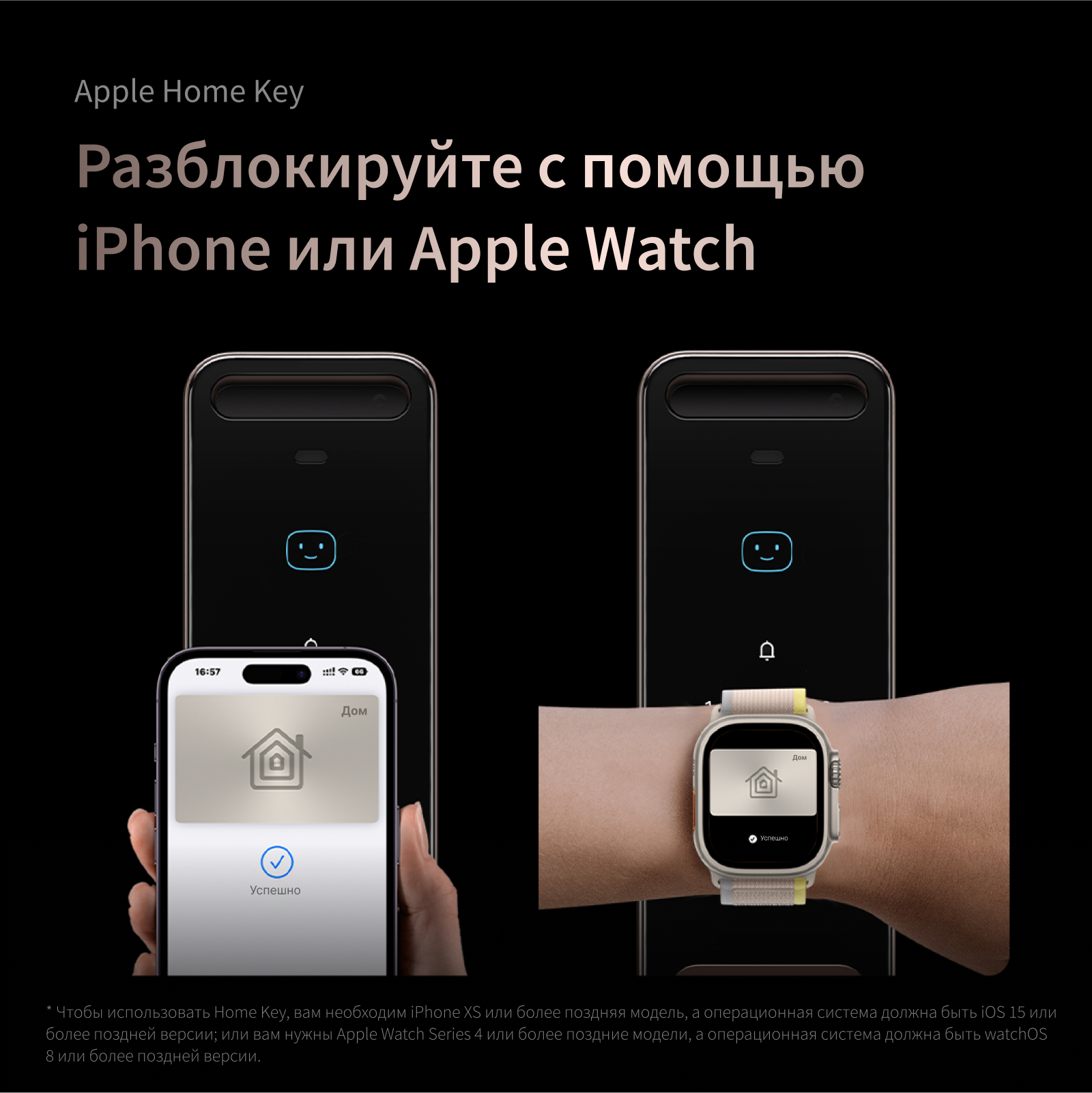 • Поддержка Apple Home Key: Интеграция с Apple HomeKit позволяет использовать iPhone или Apple Watch в качестве цифрового ключа для разблокировки двери.